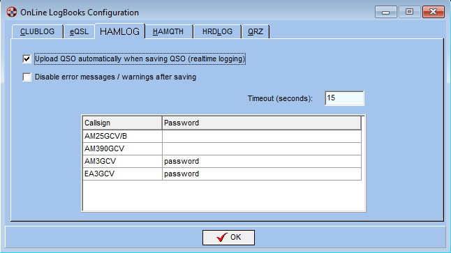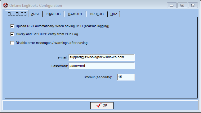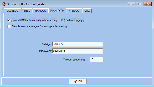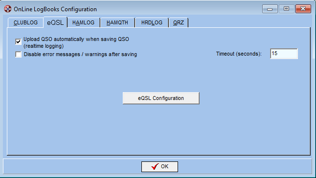 Depending on your internet connection and server work load, the time response from server may vary. Set in the timeout field the maximum time (in seconds) you want to wait before skipping to the next QSO.The default timeout value is 15 seconds.