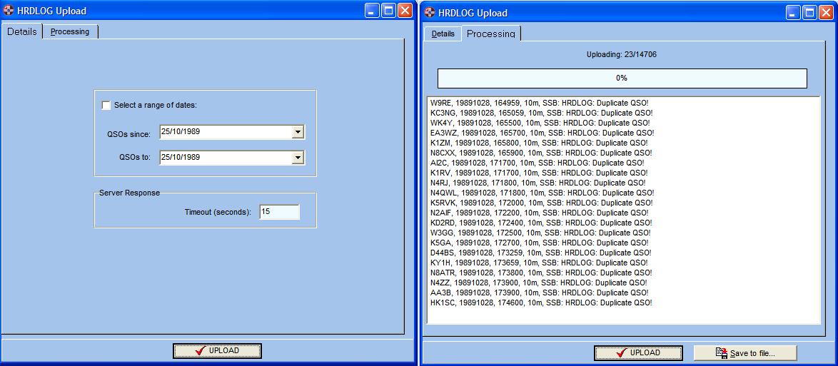 Use this function to upload your logbook into HRDLOG. QSO will be uploaded in sequence (one QSO after another) sorted by date.