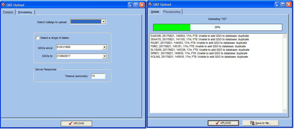 Use this function to upload your logbook into QRZ. Select the callsign to upload from the dropdown list (contains all callsigns added in all your My QTH). QSO will be uploaded in sequence (one QSO after another) sorted by date.